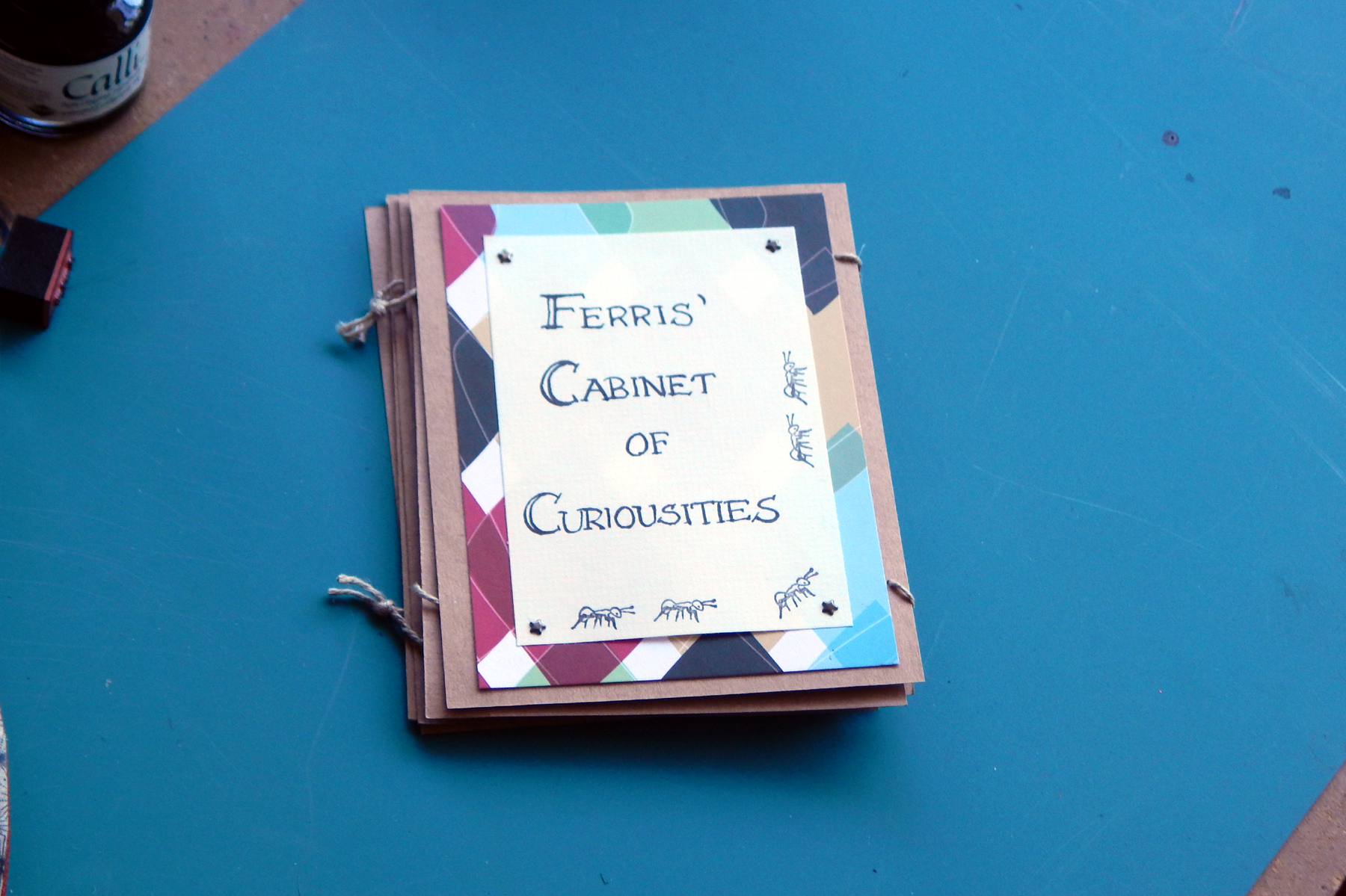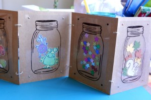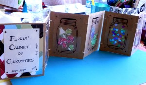This cabinet of curiosity card turned out so cute! And it actually was not as hard to make as I thought it would be. I had drawn the jar image and printed it out on acetate, “filled” them with fun items and used brads to hold the plastic in place. His parents still have the card!