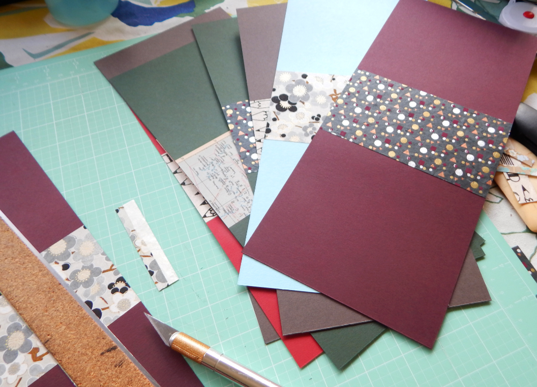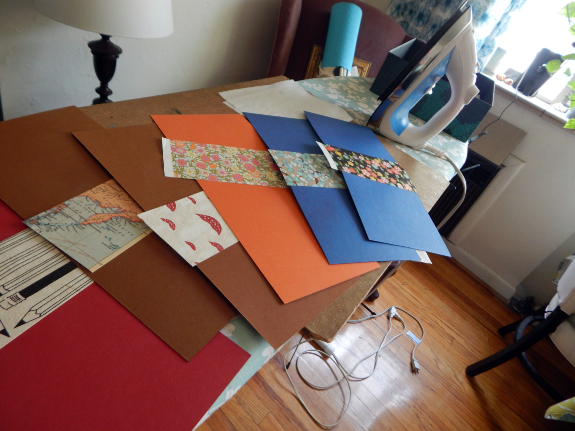 I make the covers out of various types of card stock, from the type you get at the craft store to the heavy duty stuff in big sheets from the art store. For the ones I made recently I added some decorative paper to add interest and to reinforce the spine. Wonder Under is an excellent adhesive for this! The covers are pre-folded and then I start the binding process.
