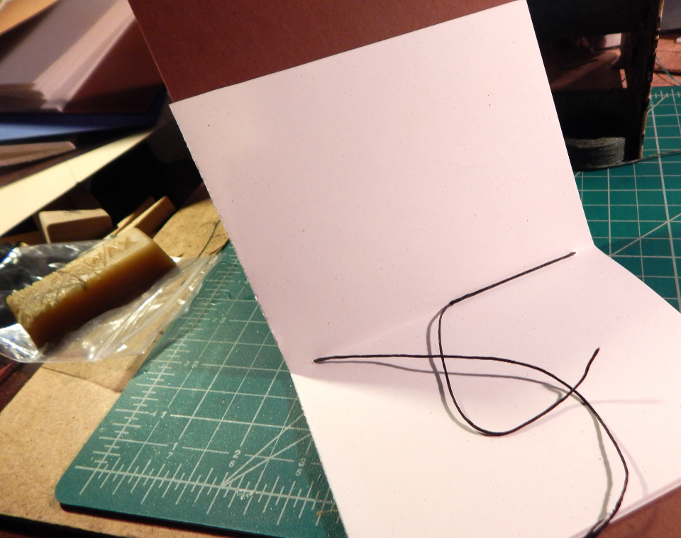 The signatures and the covers both need to have holes pre-punched for sewing and I make a pattern to make sure the holes are in the same place. Then I sew the book and cover together with waxed thread. I like to knot the thread in the middle of the book to protect it but sometimes I leave it on the outside.