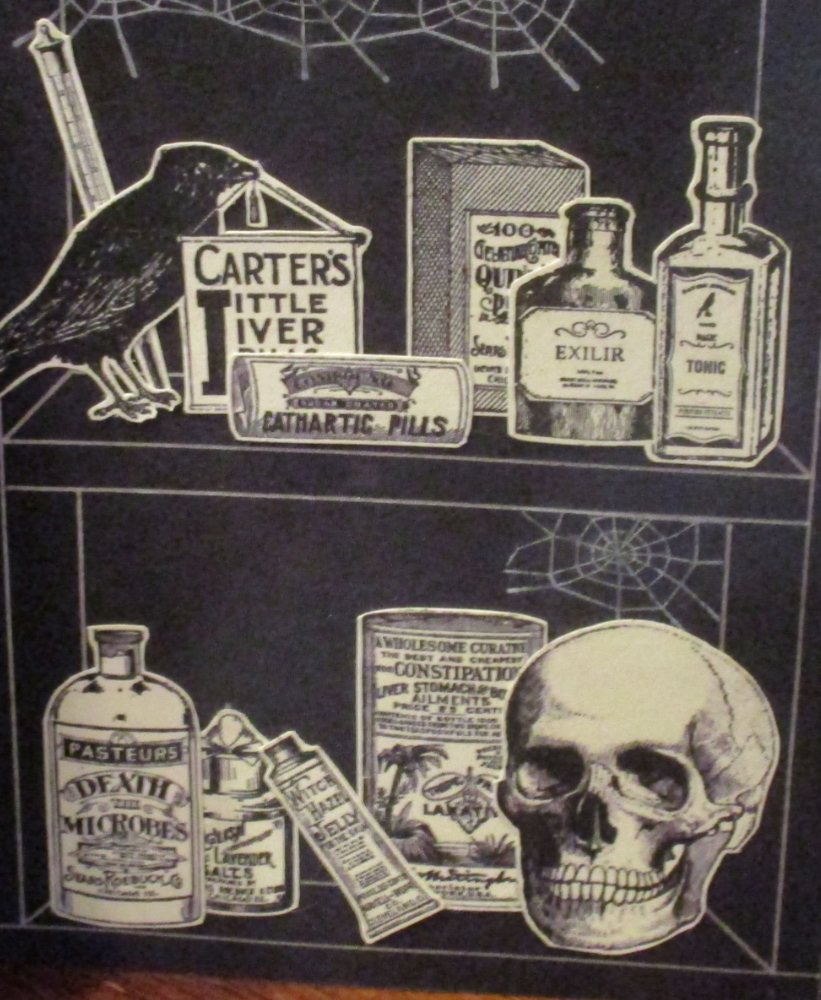 I used images from all over, some where stamps, some from the internet, but most were from a Dover book I have of Victorian Goods and Merchandise. So many spooky bottles and salves! I printed them on card stock and cut them out. I also drew the shelves inside the cabinet and added the spiderwebs with another stamp.