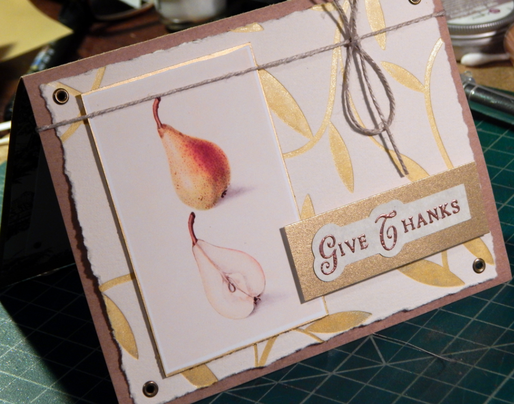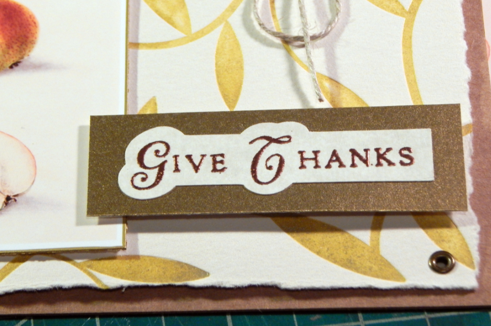 I wanted to have a nice sentiment on the card, so I stamped out a bunch of “Give Thanks” and heat embossed them with copper powder. I do like all the warm metallics for fall!