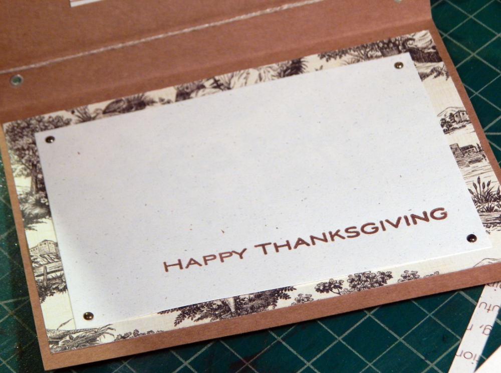 For the inside of the card I used the letterpress and a “Happy Thanksgiving” plate. I also used some toile patterned paper that I have had for years in my stash!