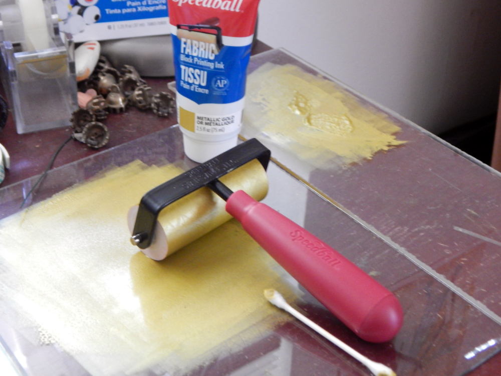 I ended up using Speedball Fabric Block Printing ink, it is an oil based product (so protect your skin and use in a well ventilated area!) but can be cleaned up with water which is nice. It is not the best ink for this type of printing, but it did work. I will have to be careful if I get the custom plates made because you can’t get them wet, but if you get the ink on the plates properly you can just wipe the ink off without much cleaning.