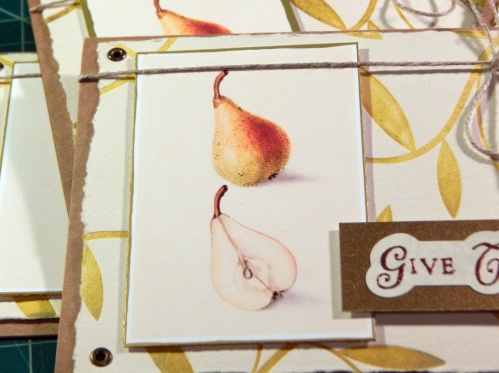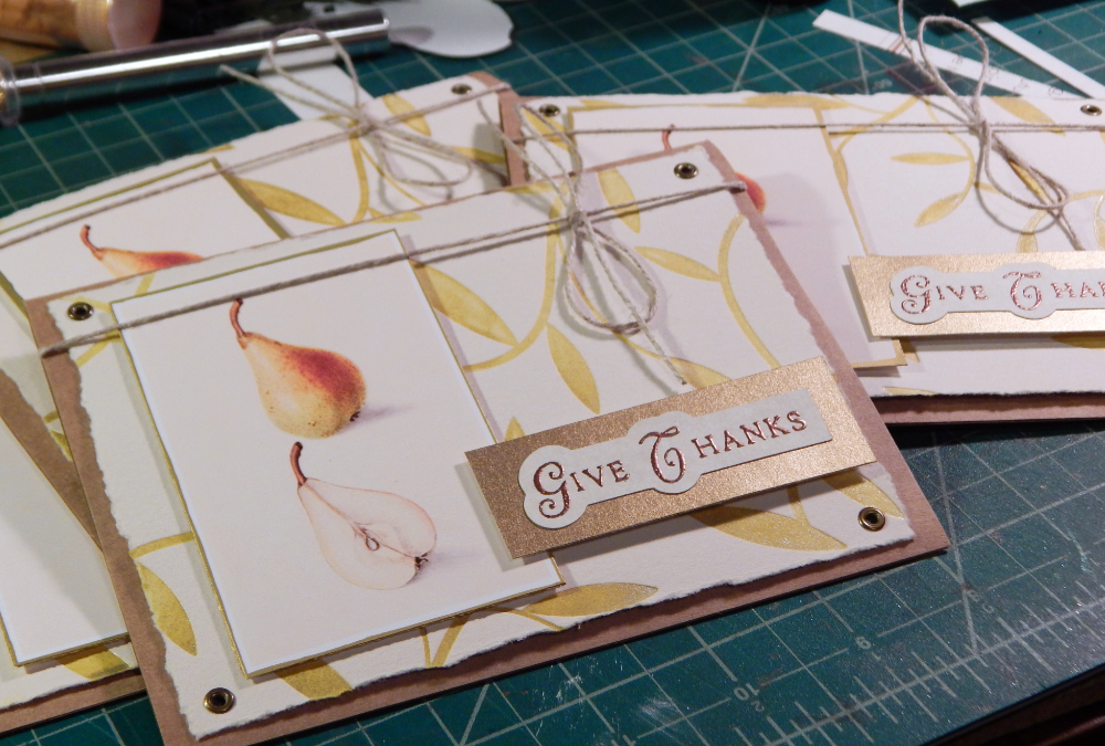 I wanted to have a nice sentiment on the card, so I stamped out a bunch of “Give Thanks” and heat embossed them with copper powder. I do like all the warm metallics for fall!
