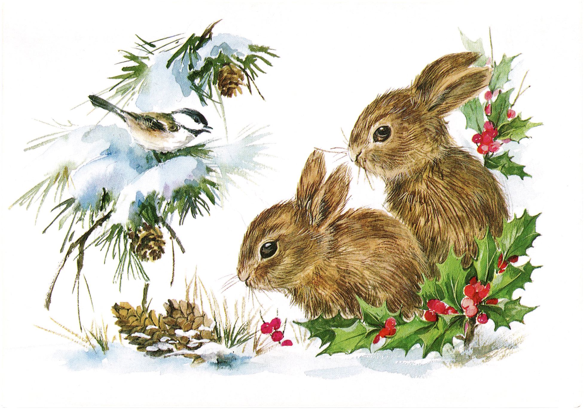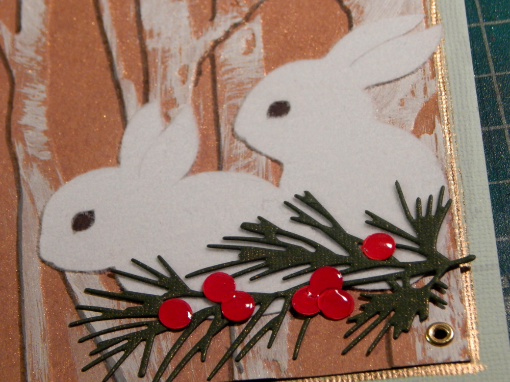 This year I really wanted to use my Tim Holtz birch tree embossing folder. It was one of the first ones I ever bought and I still hadn’t used it! I embossed some brown cardstock with it and used white paint to color the trees. I also added a shadow to bring out the embossing. It followed to use my winter branches die set (also from Tim Holtz,) but that did not make much of a card. After looking at some vintage Christmas images I was inspired to add bunnies!