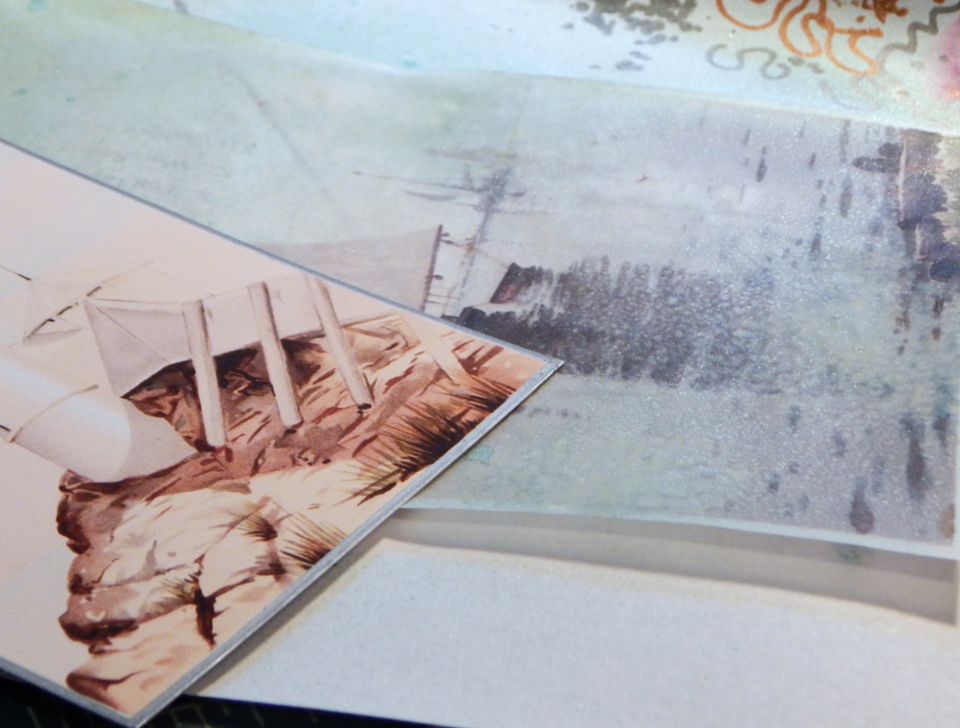 At first I was going to use the whole image, but then I thought it would be fun to add some more layers, like I do. I found another nautical image in my digital stash and printed it out on vellum for some translucency. That was good, but I couldn’t resist spraying it down with some glitter spray!