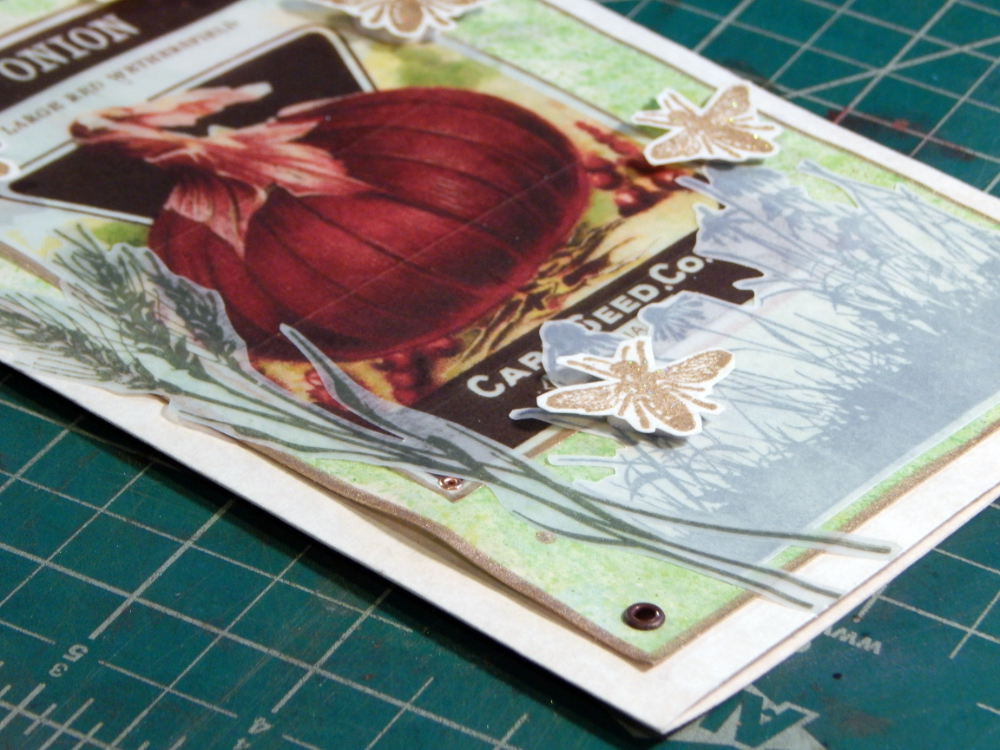 I then did some stamping and printed out the seed packet image on velum. This red onion was a great contrast to all the greens and golds.