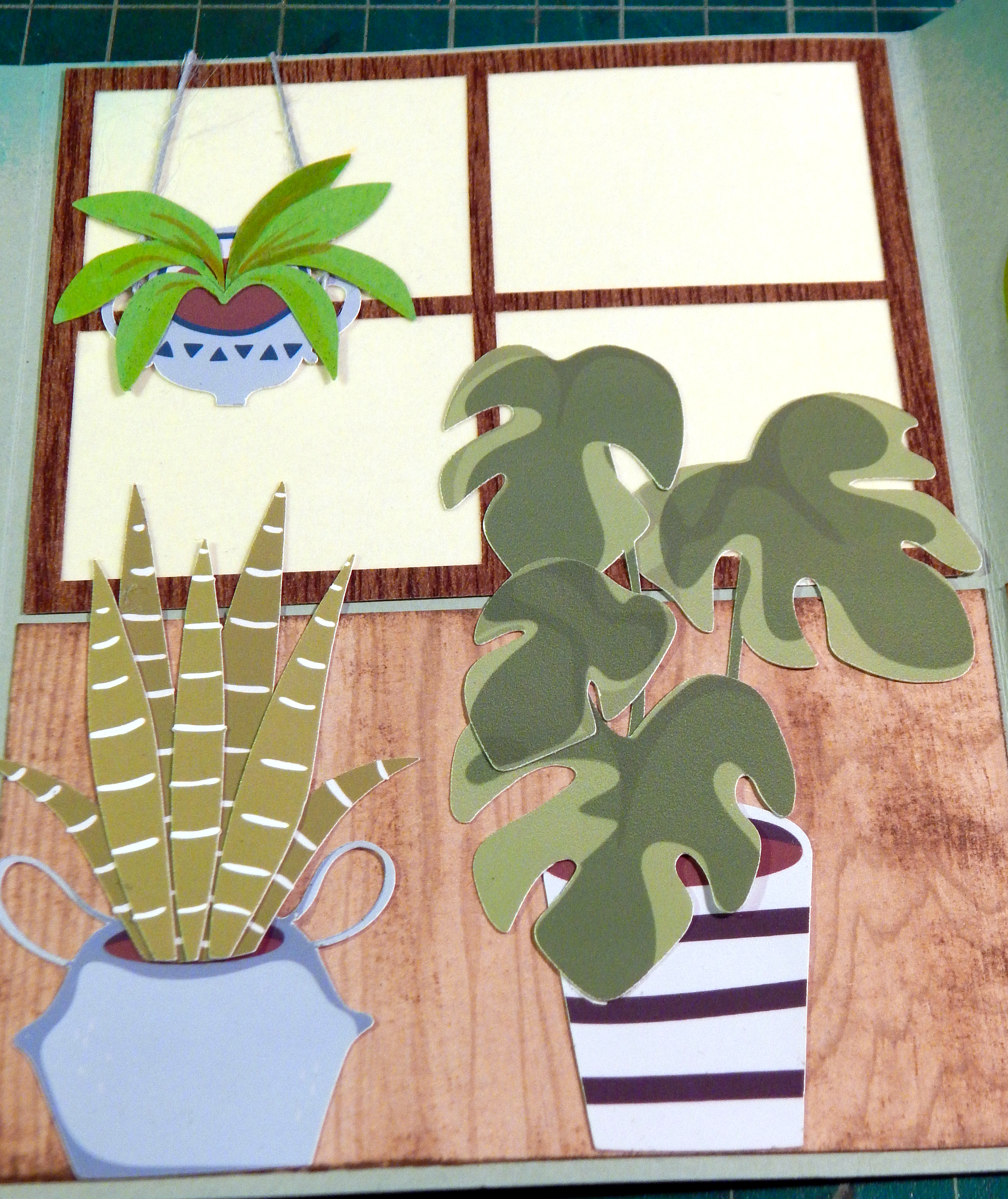 The images that I had were vector images, which I was able to take advantage of and cut them on my Silhouette machine. Some I printed and cut, and some I cut out of colored cardstock. Not my best idea. The printed plants did not look as good as the colored cardstock ones. In real life the difference was not as bad as in the photographs, but in the future I will not mix the two like that. I would print and cut the pots and do cardstock for the plants maybe, just keep it consistent with the type of image.