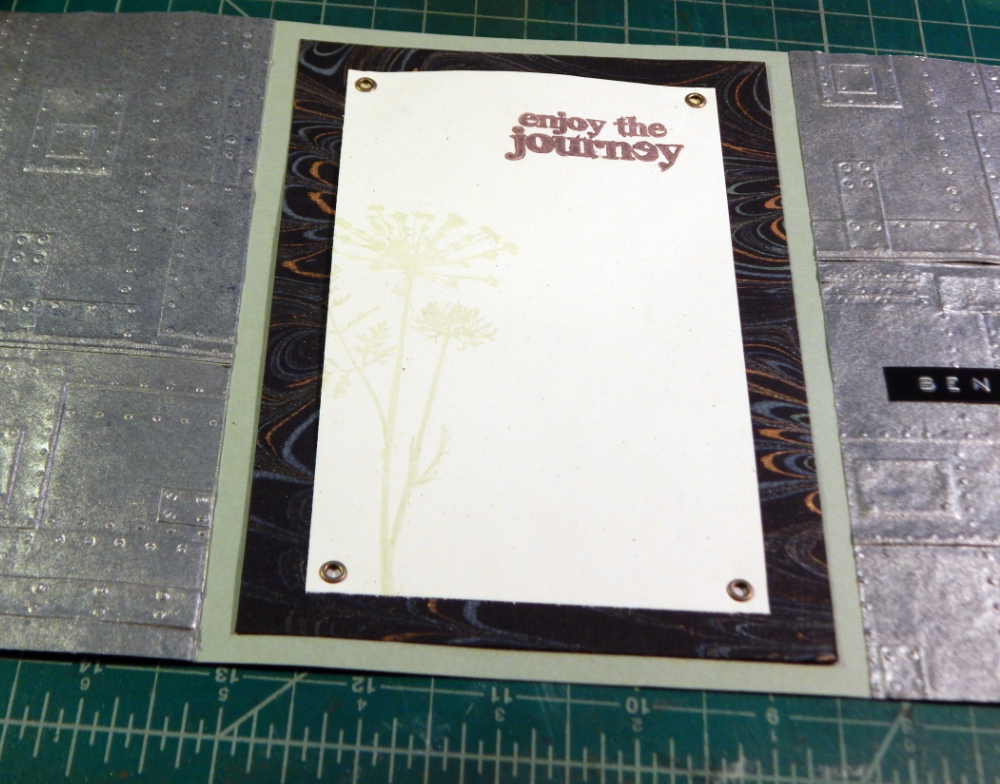 My idea was big, I wanted a whole plant store, and in contrast, something to represent the daily grind of the unhappy job (whoa, things just got really conceptual there!) So I decided to do a triptych card (or is a bi-fold, I don’t know, maybe both.) For the outside I used my deep embossing folder of metal plates and my gear die.