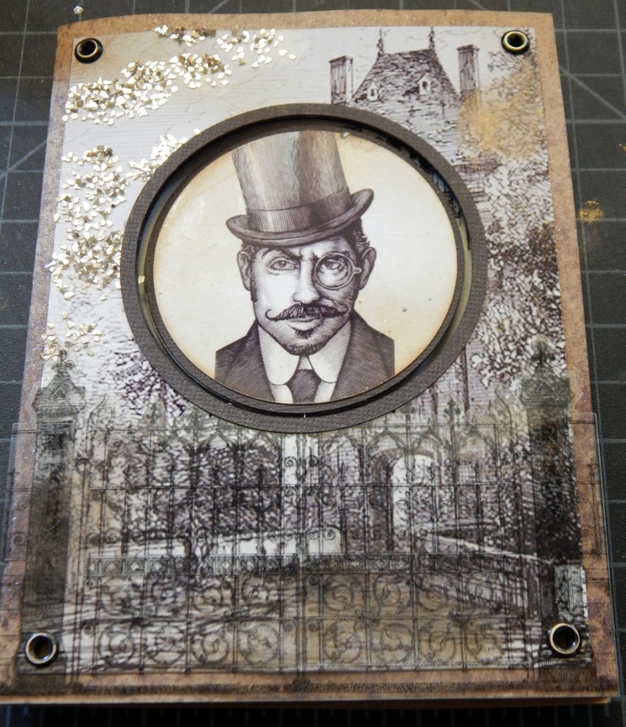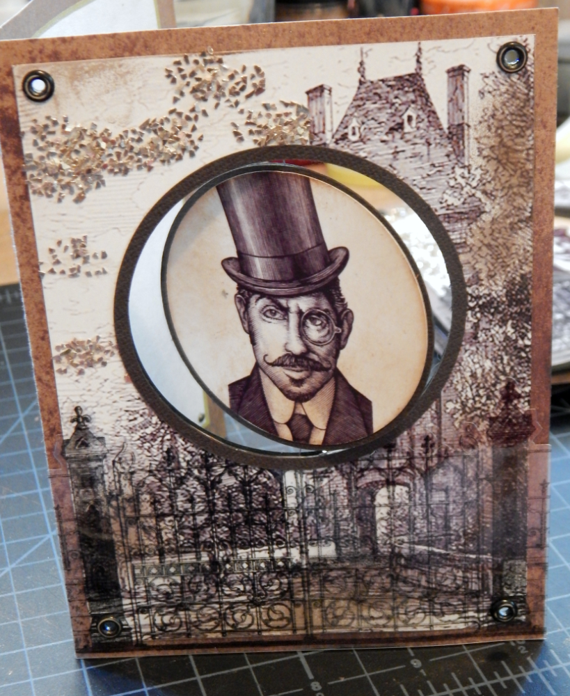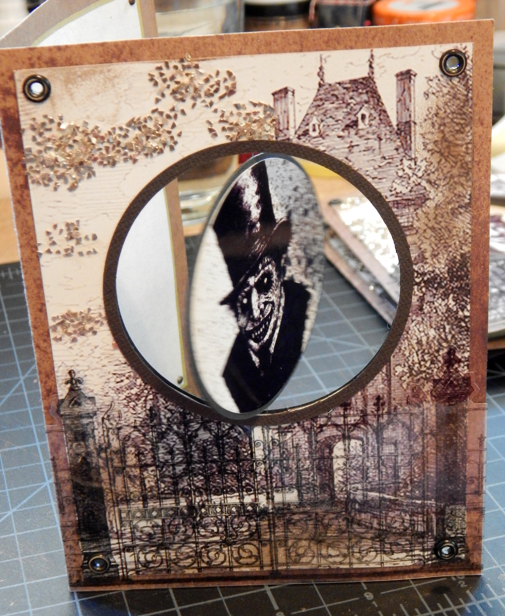 I had also added and additional layer to the front with a gate printed out on acetate. I then took the images off, glued the spinners on (I sandwiched thread between the two face images and then glued the string to the card very carefully and insuring that the spinner would still spin) and then put the background images back on.