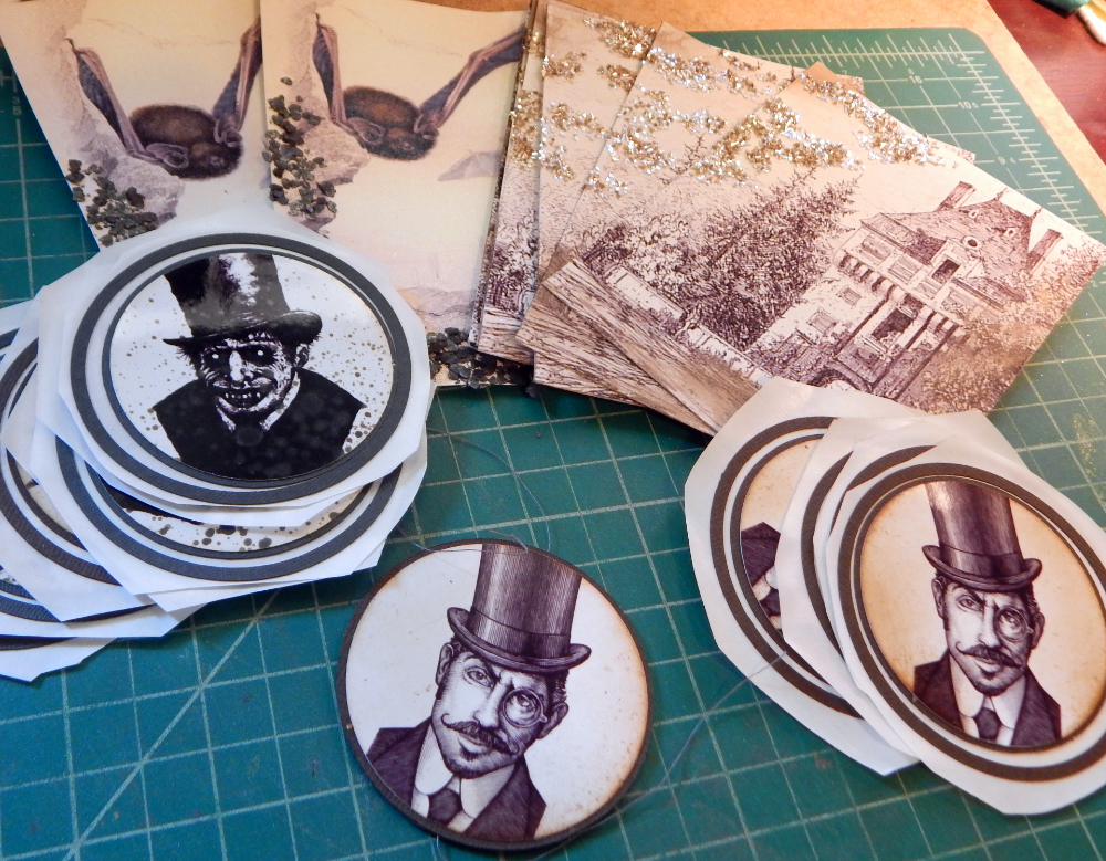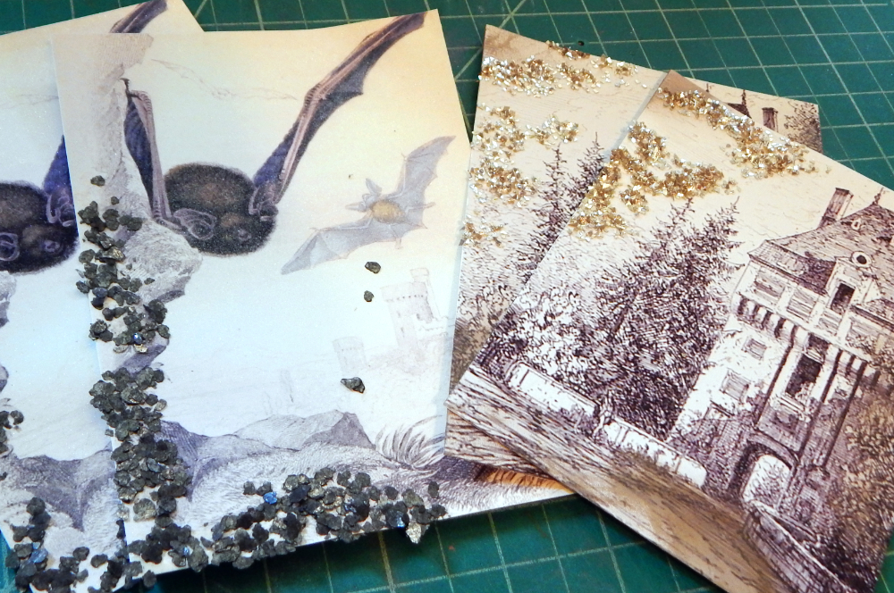 I needed backgrounds for each personality so I found in my library of images the house image and the bat and cliff image. I believe both of which I got from The Graphics Fairy. I added some interest to the images, some glitter spray on the bats and some metallic wax (both of my own recipes) and to top it all off, some glitter!