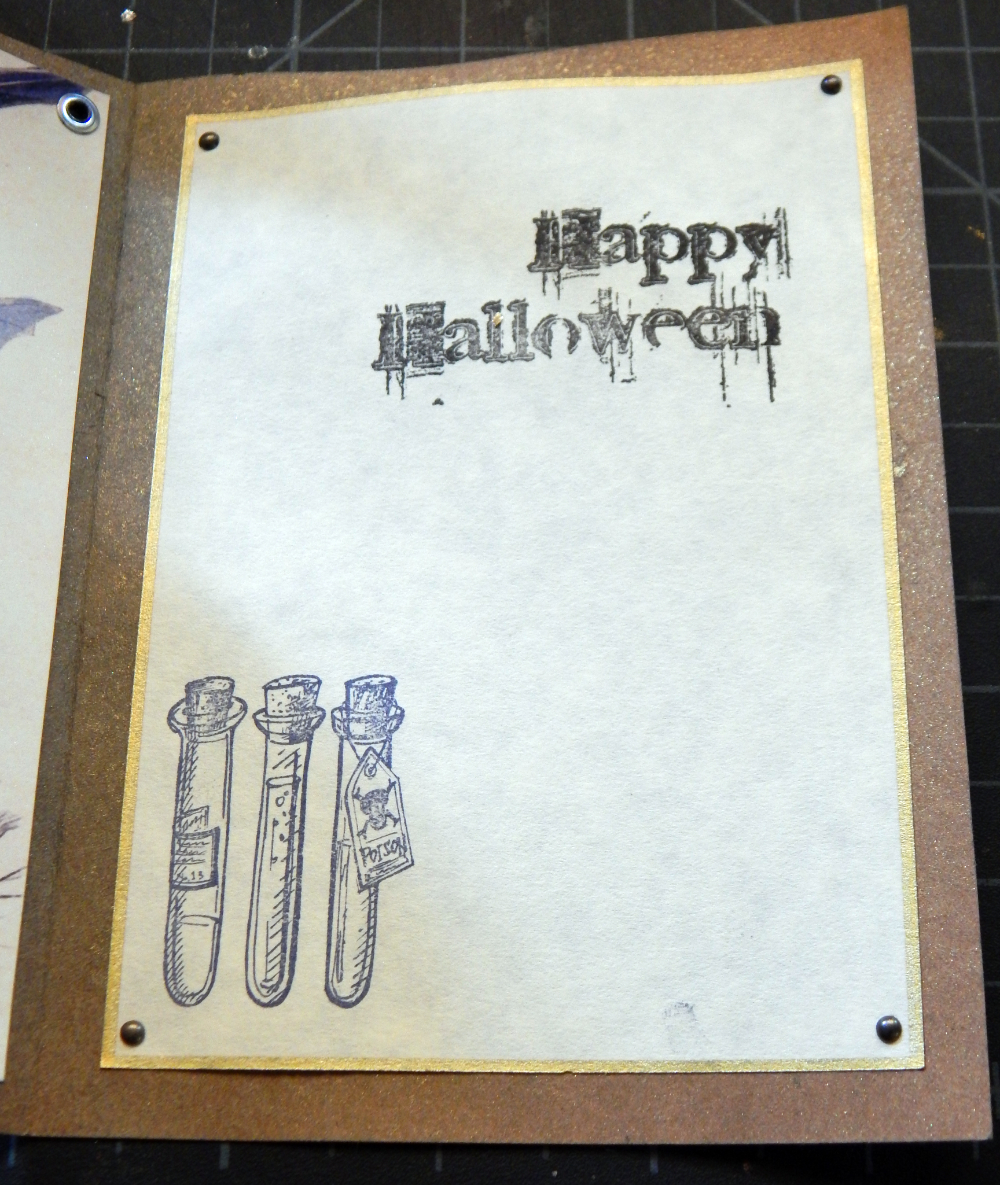 The inside greeting of the card I used a fun test tube stamp and a custom made Halloween greeting stamp.