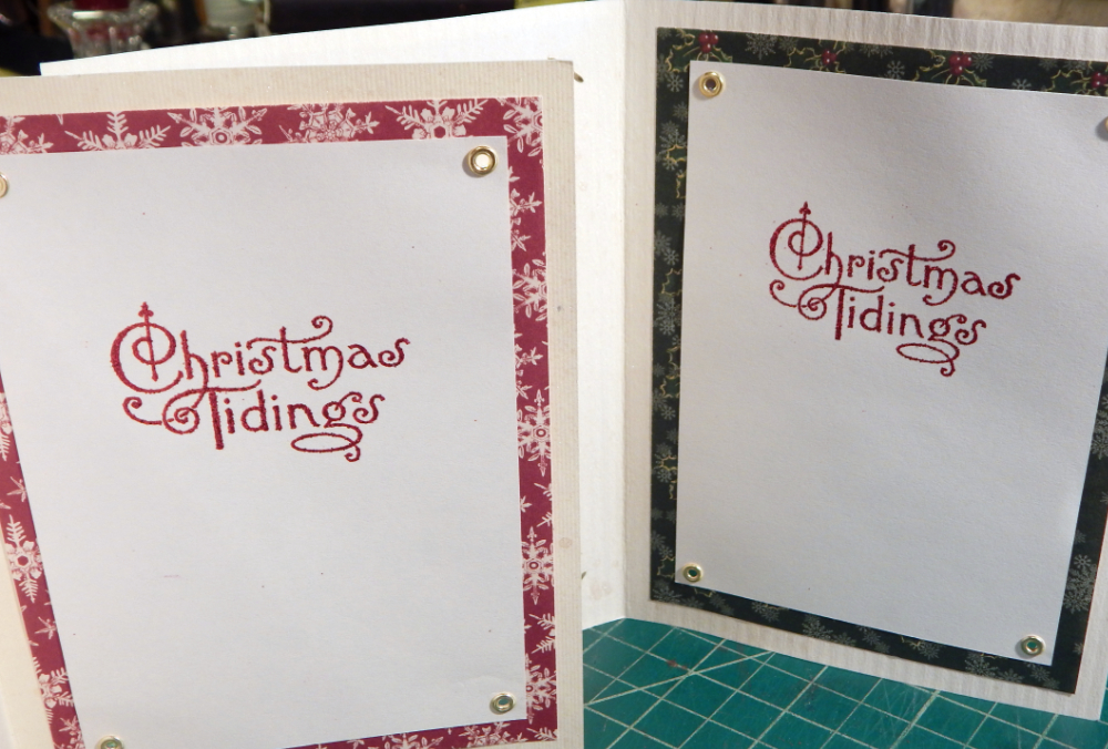 My “Christmas Tidings” stamp worked perfectly with these Victorian cards. And I used different accent paper in the inside (yay for using up paper!)