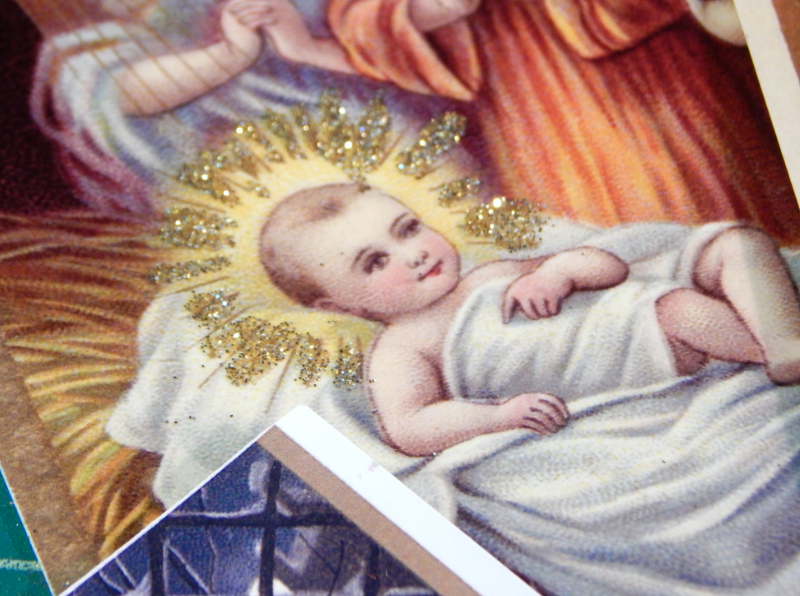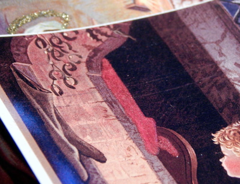 Such a nice deep impression! I also glitter sprayed the cardstock for the base of the cards. When you start early you can wait for things to dry a long time. Then I started embellishing the images! I used glitter and flocking powder.
