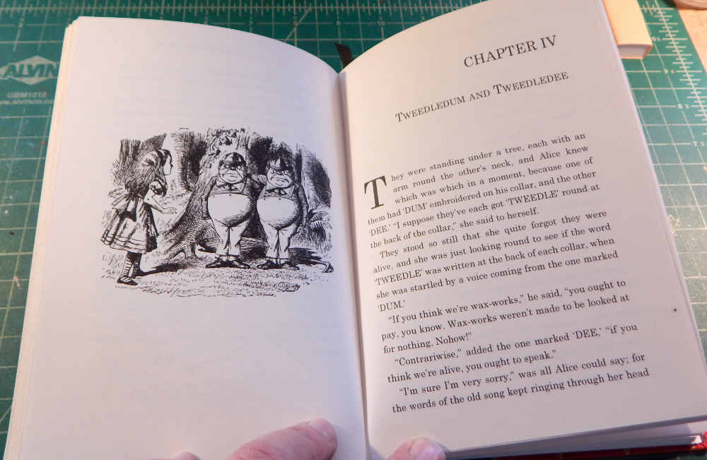 I got to use my red and white endbands and I always like a ribbon bookmark so I added that too. I also wanted to emphasize that when you are reading Through the Looking Glass, the book is upside down.