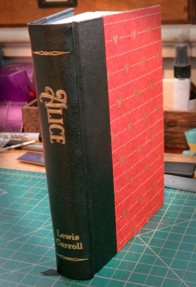 I got to use my red and white endbands and I always like a ribbon bookmark so I added that too. I also wanted to emphasize that when you are reading Through the Looking Glass, the book is upside down.