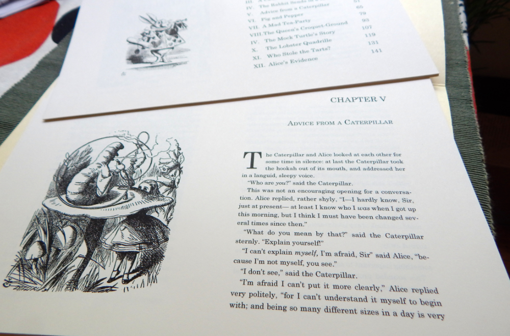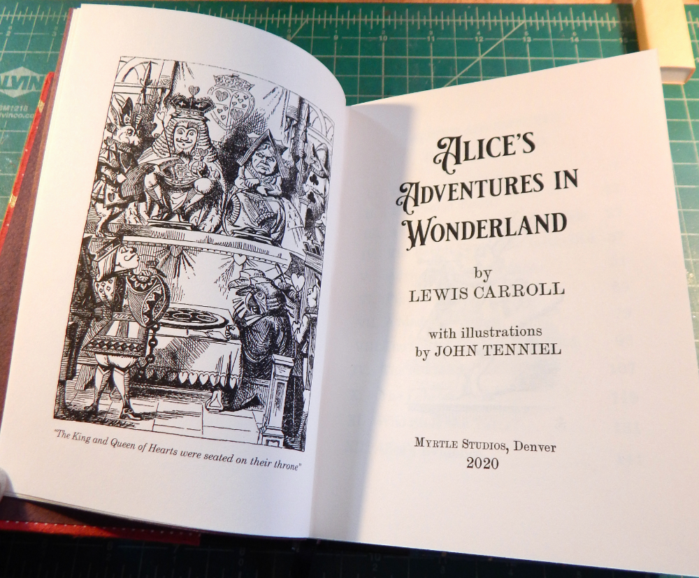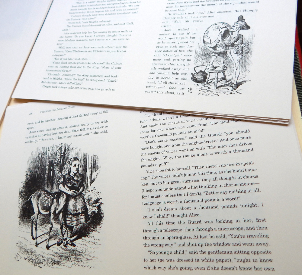 One of the main reasons that I wanted to have so much control (other that wanting things to look just so) was I wanted to flip the Through the Looking Glass book. You open the book from the front, the red side, and you read Alice’s Adventures in Wonderland; then you flip the book over and starting from the back, the blue starry side, and you can read Through the Looking Glass!