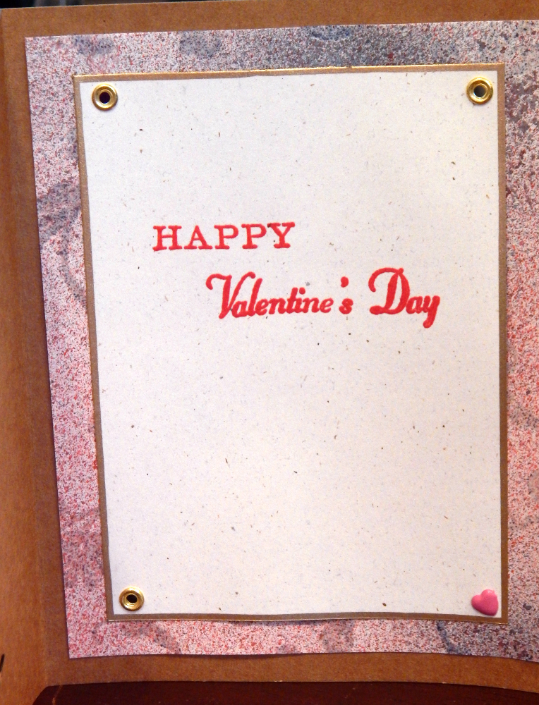 I had decorated some paper with glitter sprays and some stamps and I used it in the inside. The stamped sentiment on the inside was from an old Anna Griffin stamp set and I also embossed it with clear powder with red ink. And I couldn’t resist adding a cute heart brad!
