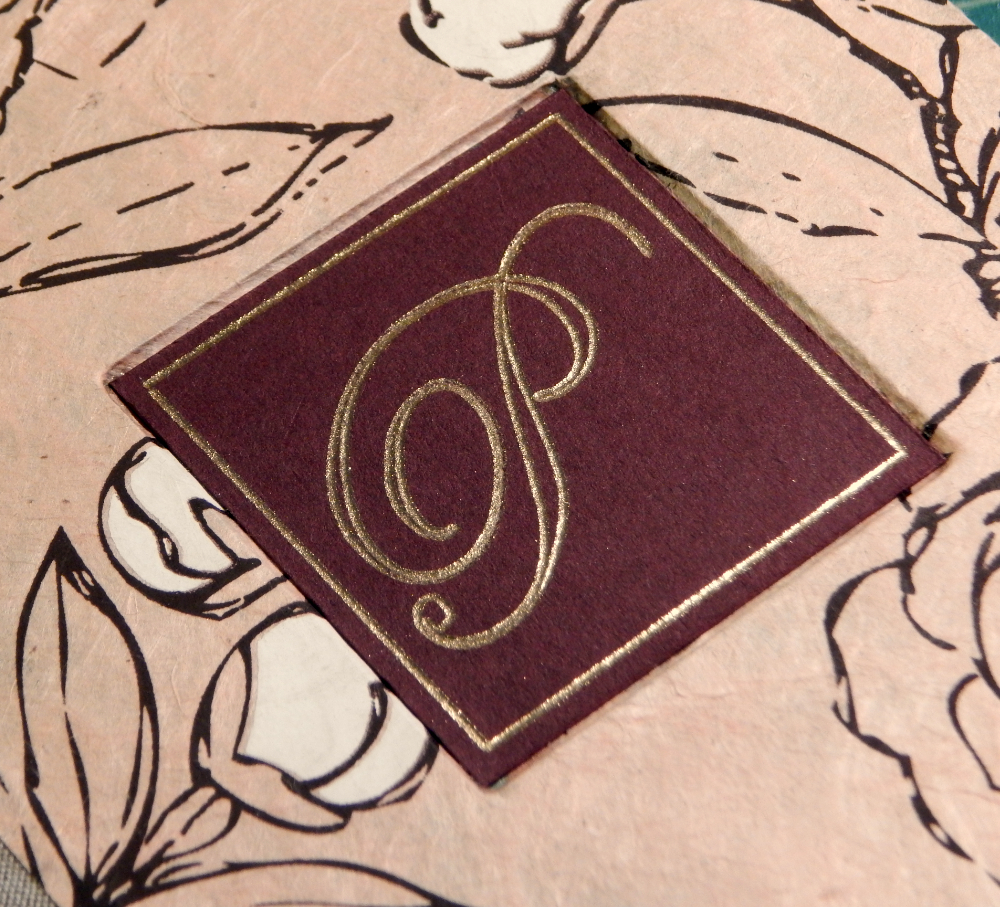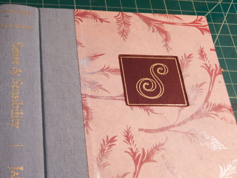 Then on to the fun part, the binding! I chose different papers and fabric for this book, but I wanted it to coordinate with S&S so I did the same type of monogram on the front. Both of them are inset into the book boards.
