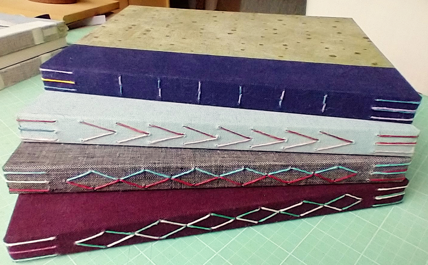 For sketchbooks I like to do binding styles that allow the book to open and lay nice and flat for drawing. These are an exposed sewing style of binding where you construct the covers, then sew the sections through the cover, and make decorative patterns with the stitching.