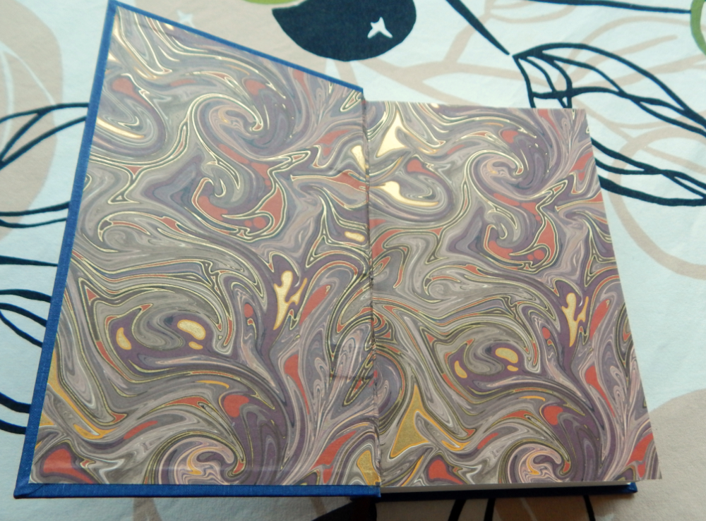 Overall I wanted do a more classic style of binding, with a full cloth cover and marbled endpapers. The best paper that I could get locally was a print of marbled paper, but at least the gold was foiled, so it still looked really nice.
