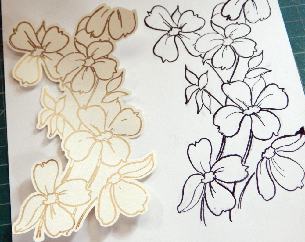 I wanted to have layers of flowers so I started with a vintage image of azaleas and some drawings. At first I was drawing lilies, the classic Easter flower, but then I started drawing dogwood flowers and that was the right flower. I made a clean pen and ink drawing and then scanned it into my computer. I was then able to make my Silhouette cutting machine draw the image using the Foil Quill accessory and cut the image out.