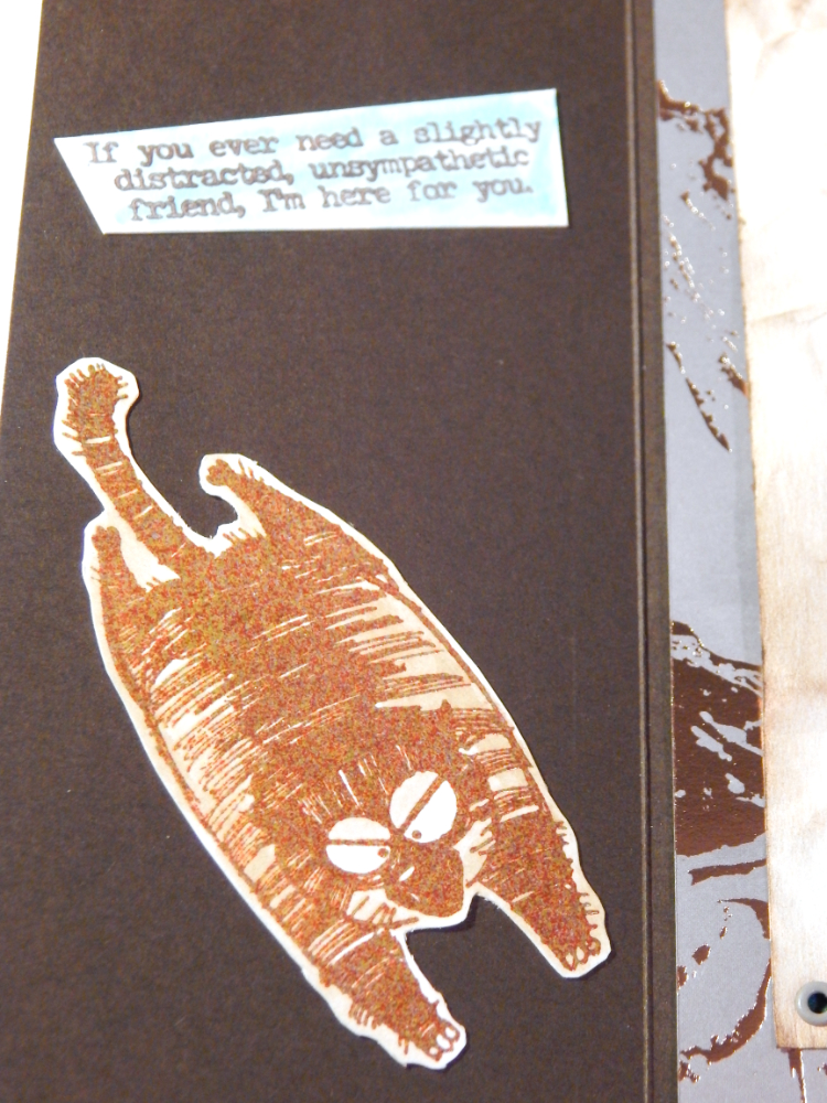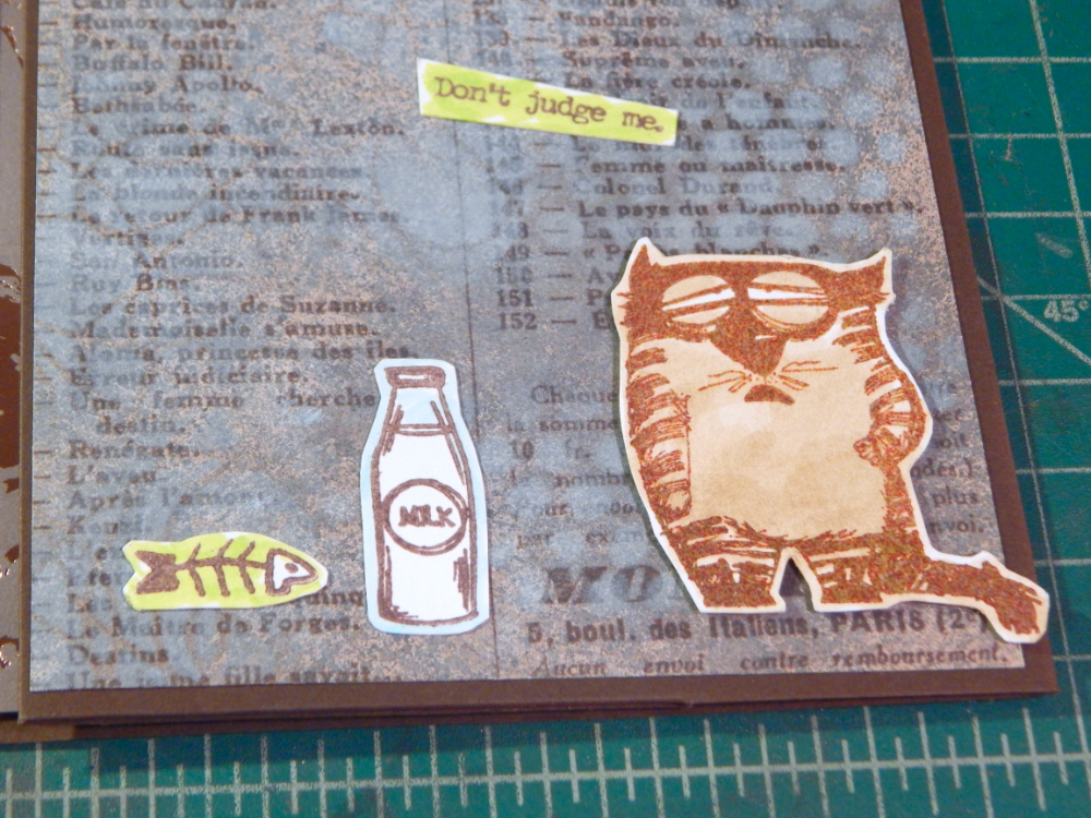 The cats in this stamp set are definitely up to no good, so that’s where I started on this card. I wanted to use all the stamps in the set (I think I ended up using all but one quote stamp) and this tri-fold card gave me lots of space to use all the cats!